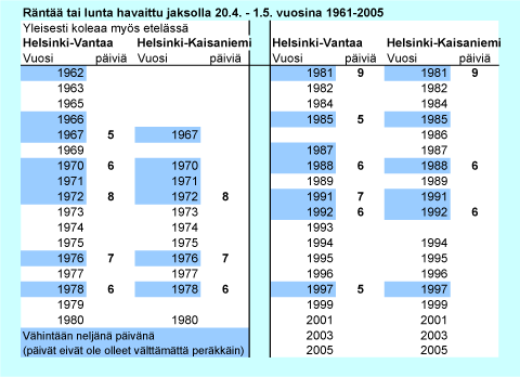 Kylmiä huhtikuun loppuja sattui 1970- ja 1980-luvulla kolme kertaa vuosikymmenessä, 1990-luvulla kaksi kertaa ja nyt 2005 sattunut kylmyys oli ensimmäinen 1992 jälkeen.