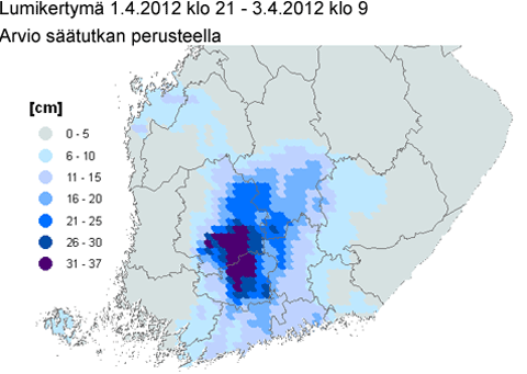 Suurimmat lumensyvyyden kasvut havaintoasemilla 1.4. klo 9 - 3.4.2012 klo 9 | cm |