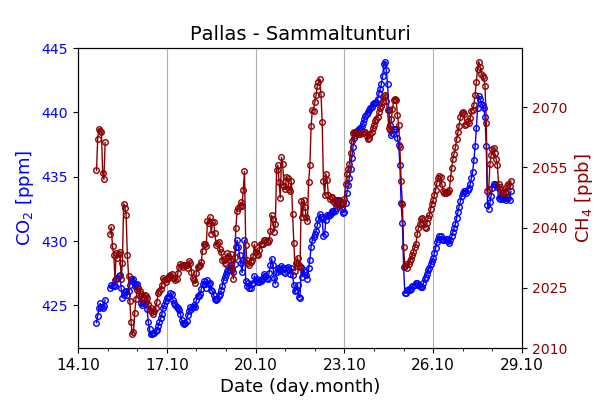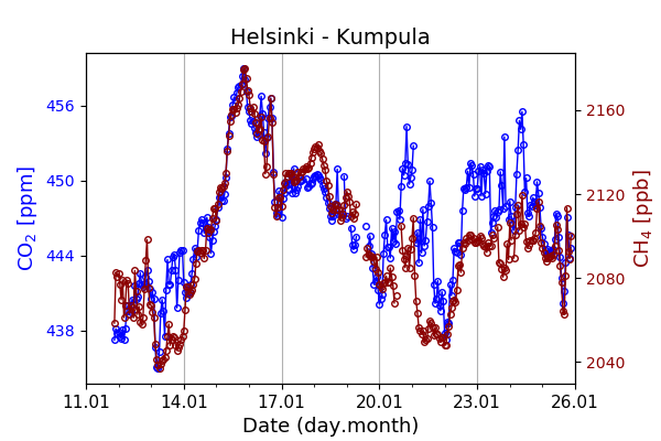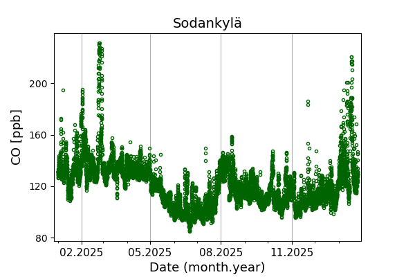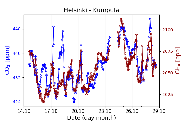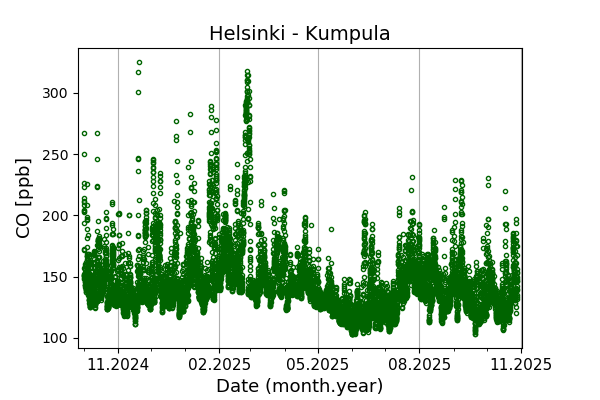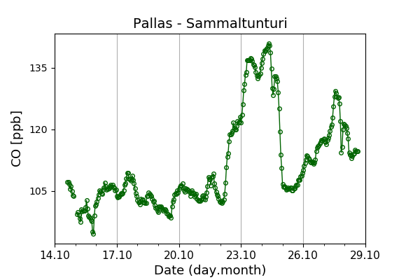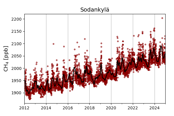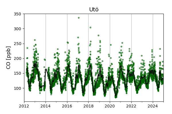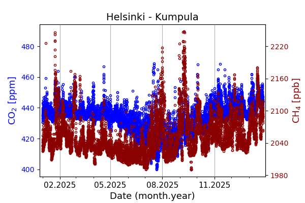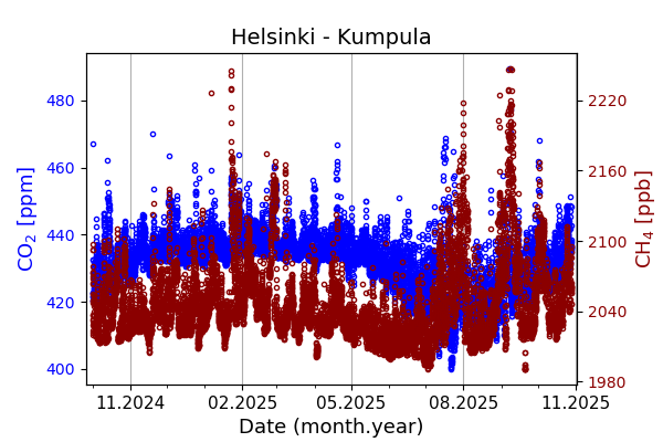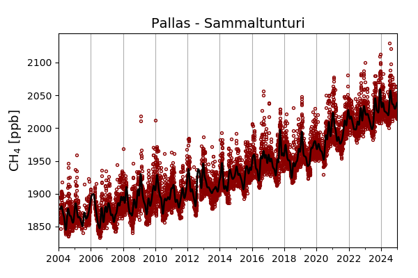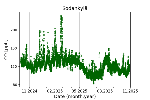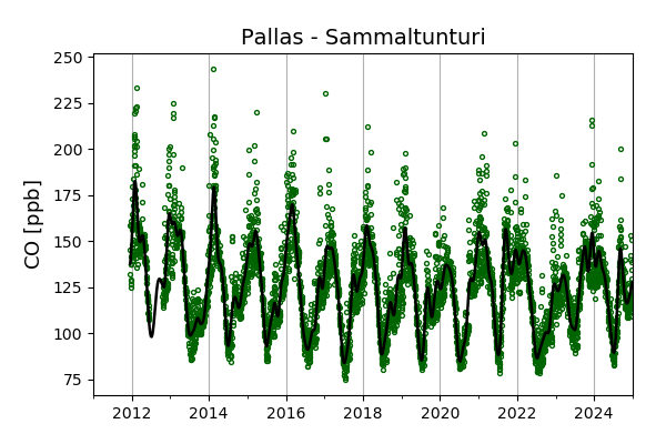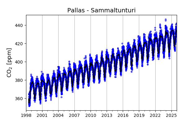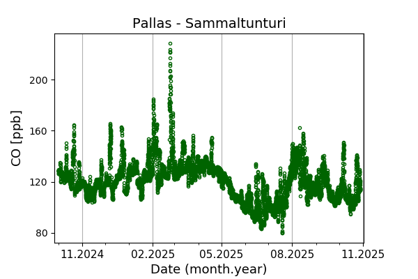 Hiilidioksidin, metaanin ja hiilimonoksidin pitoisuudet Pallas-Sammaltunturin, Sodankylän, Helsinki-Kumpulan ja Utön asemilla esitetään pitkäaikaisena usean vuoden aikasarjana (päiväkeskiarvot), sekä viimeisimmät havainnot vuoden ja kahden viikon jaksoilta (tuntikeskiarvot).