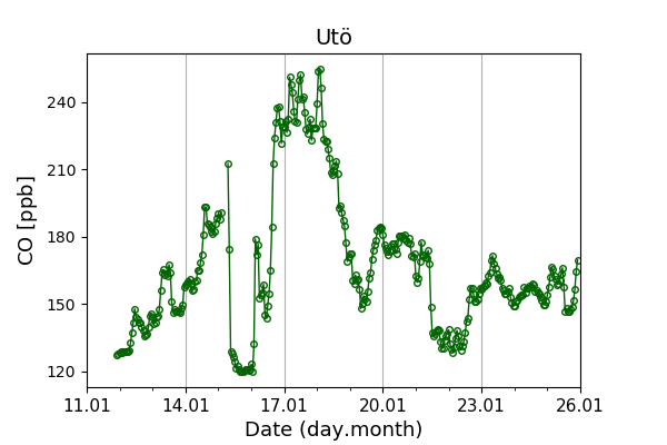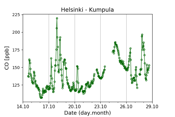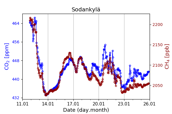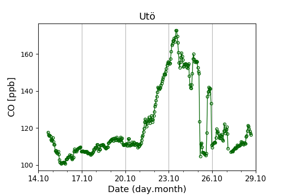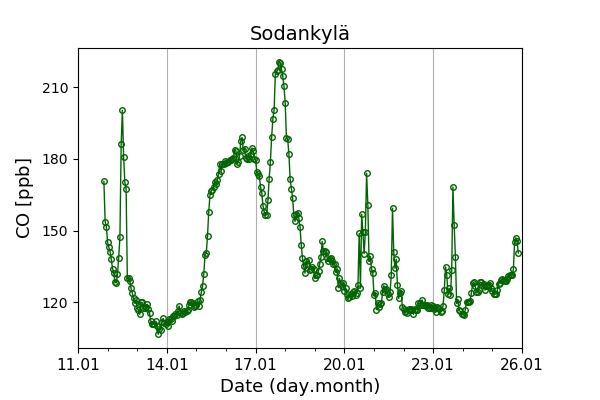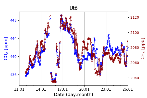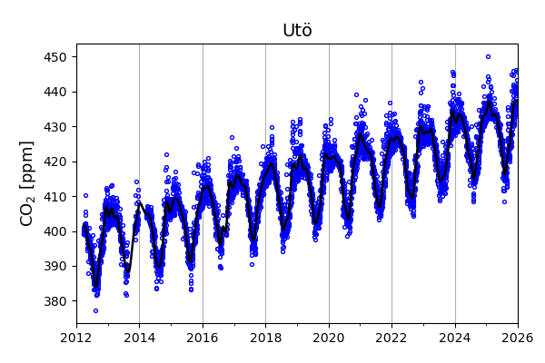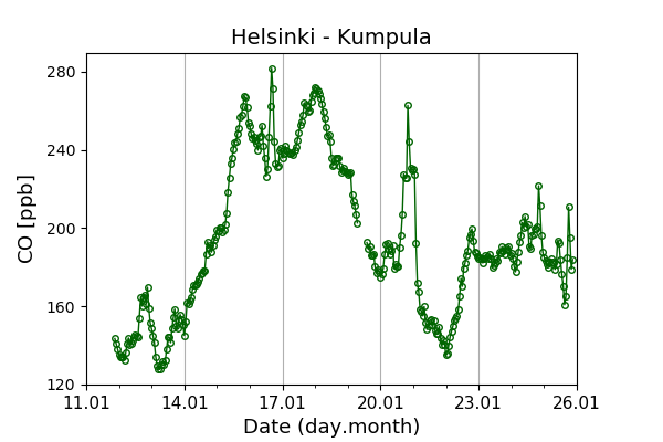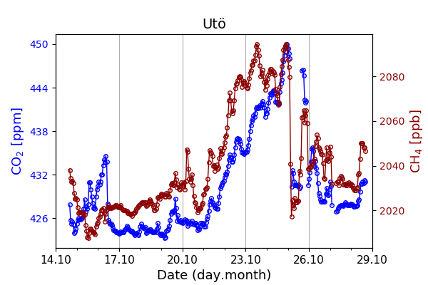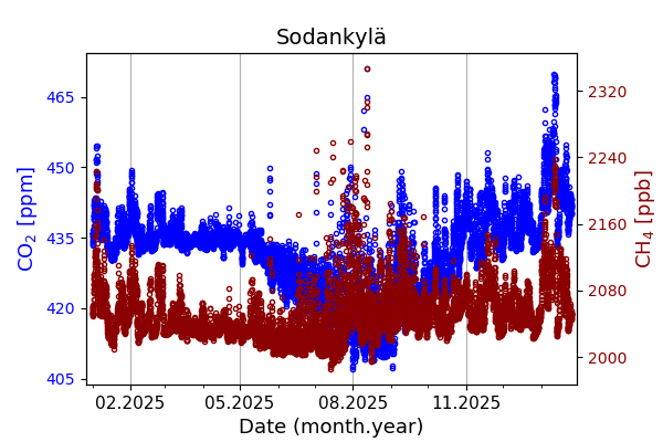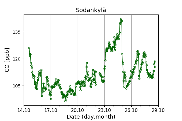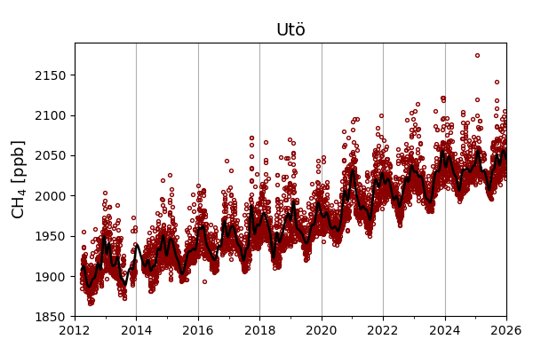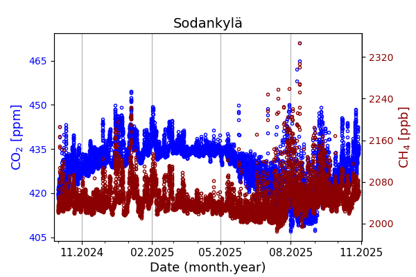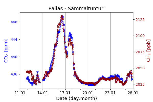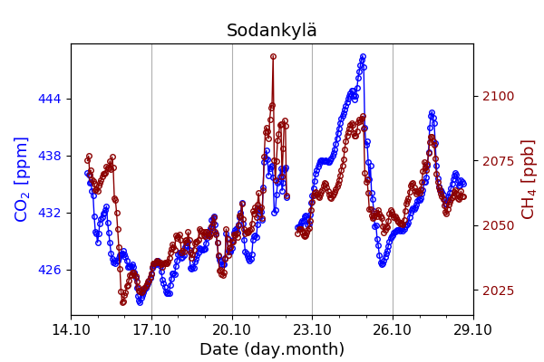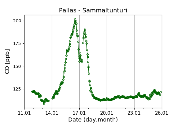 Hiilidioksidin, metaanin ja hiilimonoksidin pitoisuudet Pallas-Sammaltunturin, Sodankylän, Helsinki-Kumpulan ja Utön asemilla esitetään pitkäaikaisena usean vuoden aikasarjana (päiväkeskiarvot), sekä viimeisimmät havainnot vuoden ja kahden viikon jaksoilta (tuntikeskiarvot).