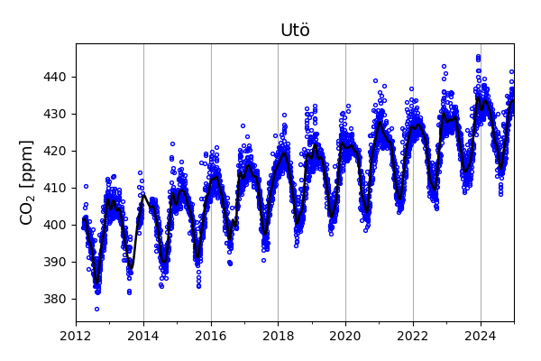 Hiilidioksidipitoisuudet ilmakehässä kasvavat noin 2 ppm (miljoonasosaa) vuodessa. Kasvukauden aikana pitoisuudet alenevat, kun hiilidioksidia sitoutuu yhteyttämisessä. Pitoisuudet vaihtelevat säätilojen myötä, kun mantereisilta tiheään asutuilta alueilta kulkeutuu korkeamman pitoisuuden ilmaa. Atlantilta kulkeutuvassa ilmassa pitoisuudet ovat alhaisempia. Kesällä, kun kasvillisuuden nielu on suuri, mantereisissa ilmamassoissa pitoisuus voi olla pienempi.