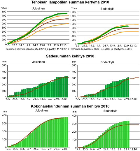 Lämpö-, sade- ja haihduntasumman kehitys kasvukaudella 2010