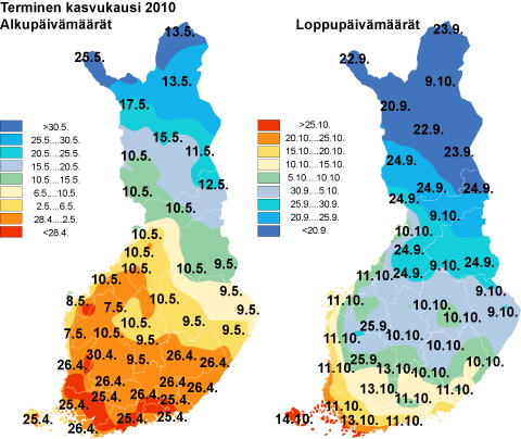 Termisen kasvukauden 2010 alkamis- ja päättymispäivämäärät