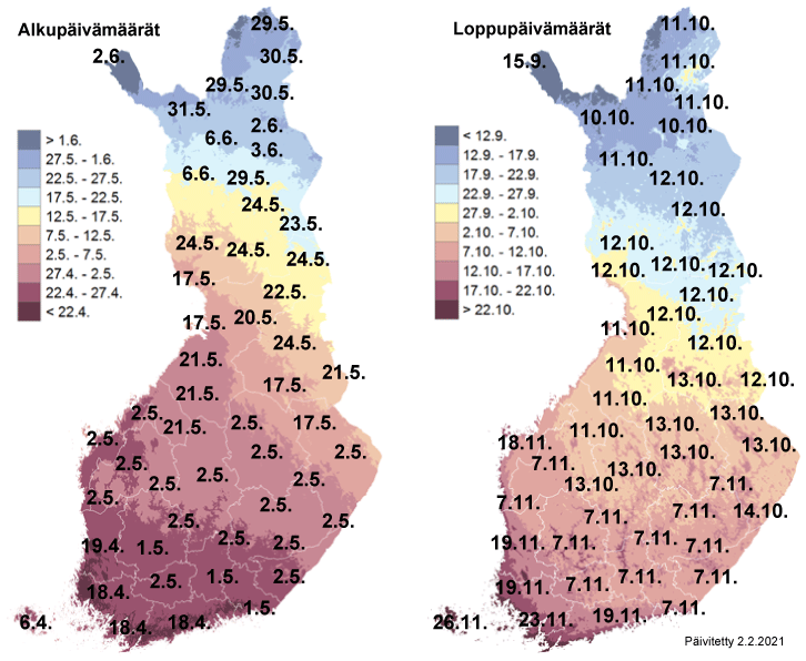 Kartan värilliset vyöhykkeet kuvaavat keskimääräistä termisen kasvukauden alkamista ja loppumista kaudella 1981-2010. Päivämäärät kartoilla ovat vuoden 2020 päivämääriä.