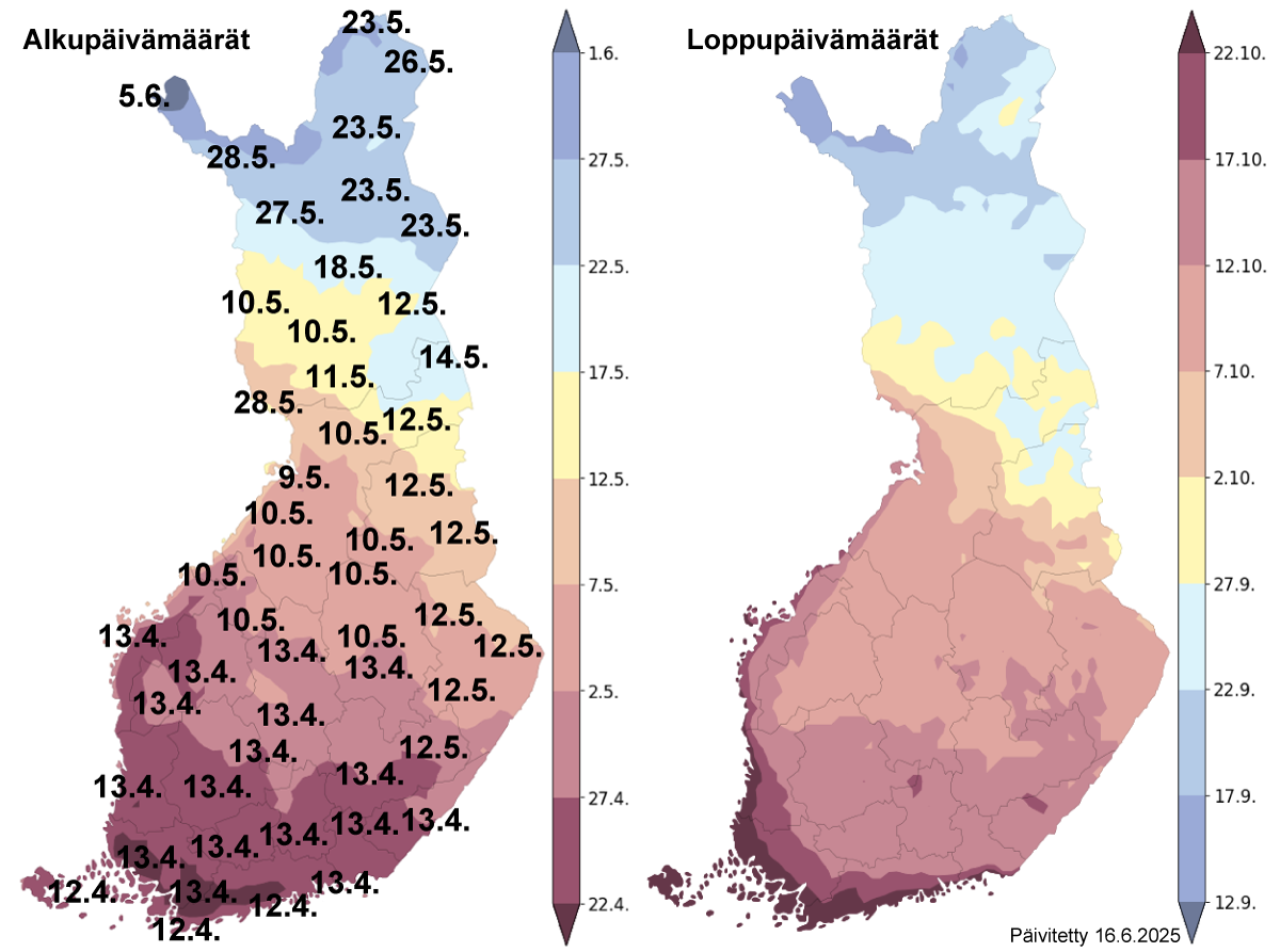 Termisen kasvukauden alkamis- ja päättymispäivät 2025