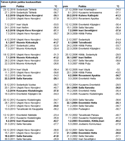 Paikka | Pakkasraja | väh. 7 vrk peräkkäin (kpl) | väh. 14 vrk peräkkäin (kpl) | väh. 21 vrk peräkkäin (kpl) |