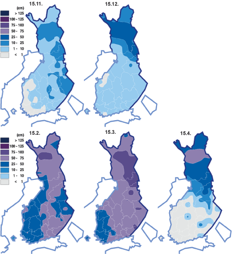 Kuluvan vuoden termisen talven ja kevään alkamispäivämäärät mustalla. Värilliset vyöhykkeet kuvaavat termisen talven ja kevään keskimääräistä alkamisajankohtaa vertailukaudella 1971-2000.