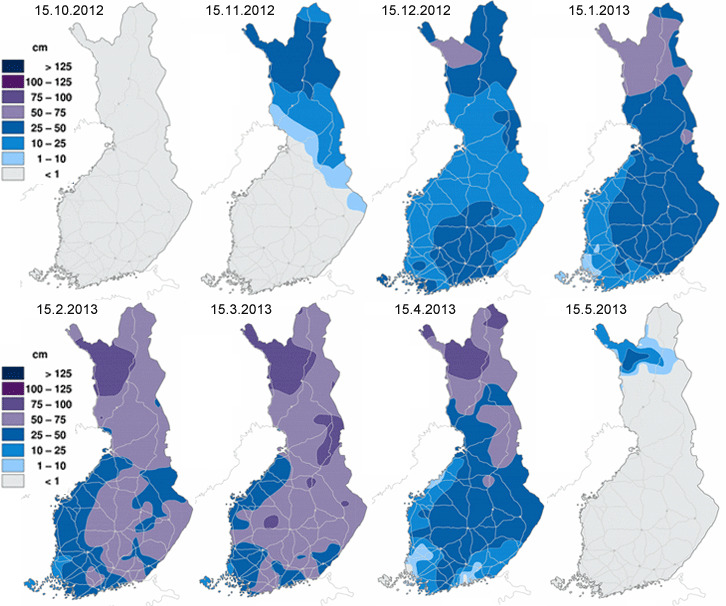 Kuluvan vuoden termisen talven ja kevään alkamispäivämäärät mustalla. Värilliset vyöhykkeet kuvaavat termisen talven/kevään keskimääräistä alkamisajankohtaa vertailukaudella 1981-2010.
