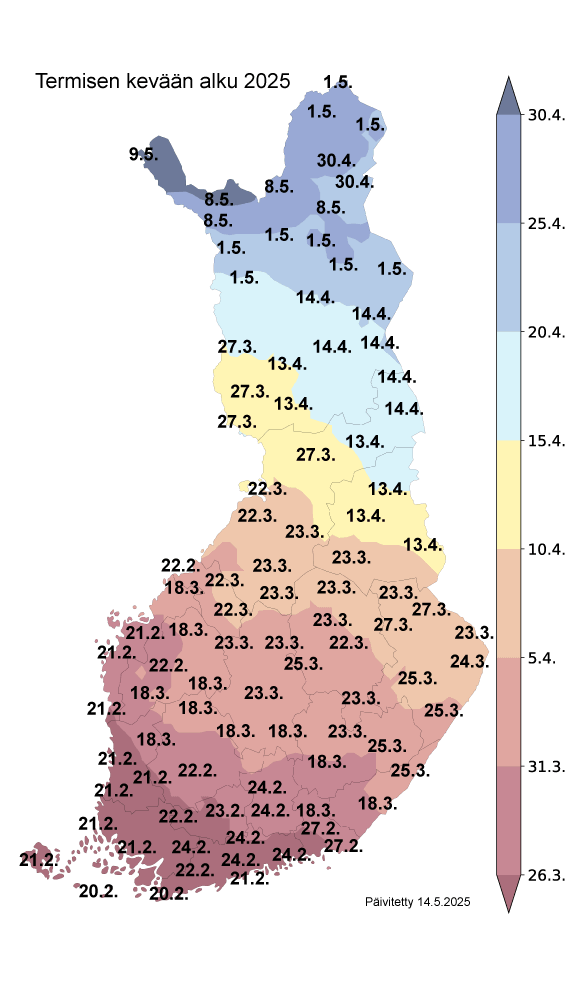 Termisen talven ja kevään alkamispäivämäärät mustalla. Värilliset vyöhykkeet kuvaavat termisen vuodenajan keskimääräistä alkamisajankohtaa vertailukaudella 1991-2020.