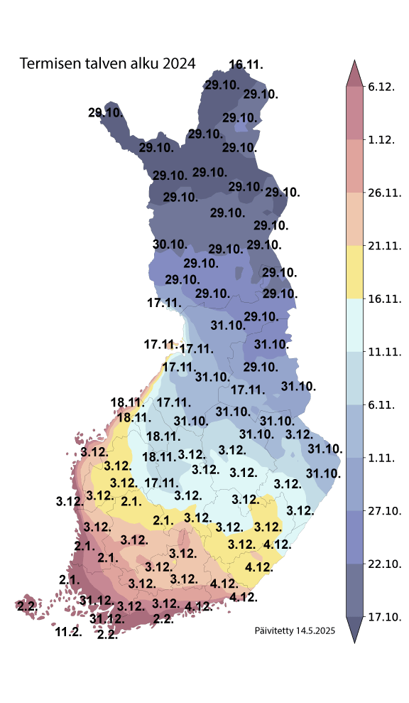 Termisen talven 2024-2025 alkamis- ja päättymispäivämäärät.